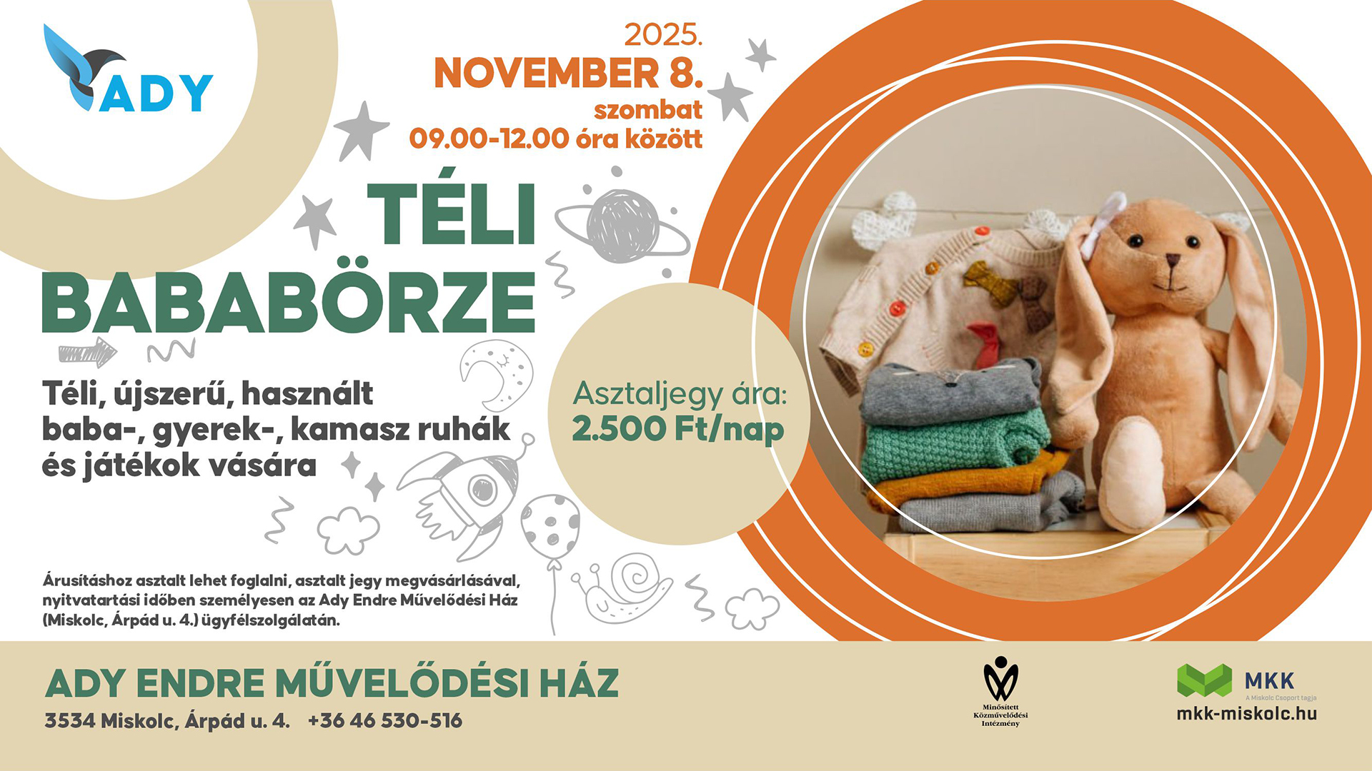 2025. november 08-án (szombat) 09.00-12.00 óra között az Ady Endre Művelődési Házban.